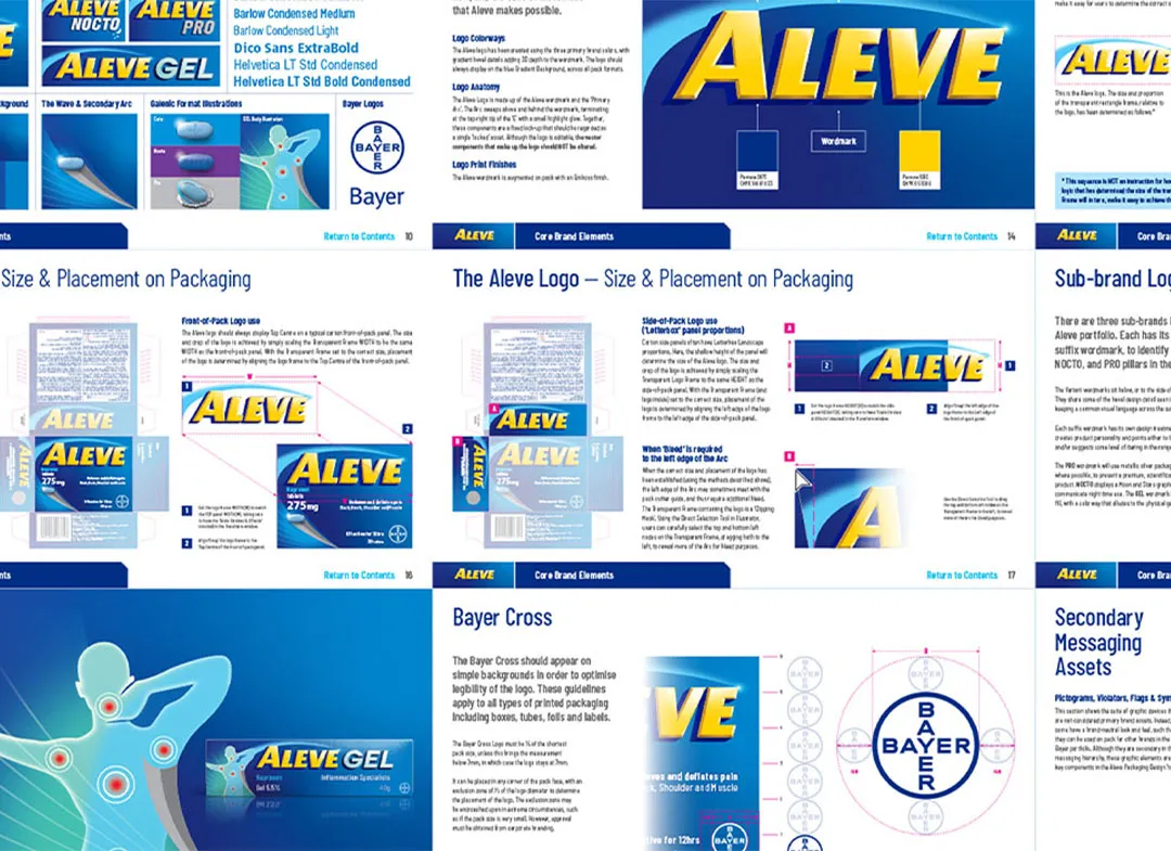 The Packaging Design Guidelines offer Best Practice Design Principles, that can be adapted to local market needs and regulatory requirements to ensure the Aleve brand shows up consistently around the globe.