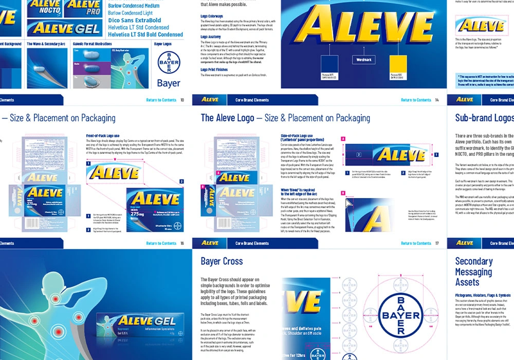 The Packaging Design Guidelines offer Best Practice Design Principles, that can be adapted to local market needs and regulatory requirements to ensure the Aleve brand shows up consistently around the globe.
